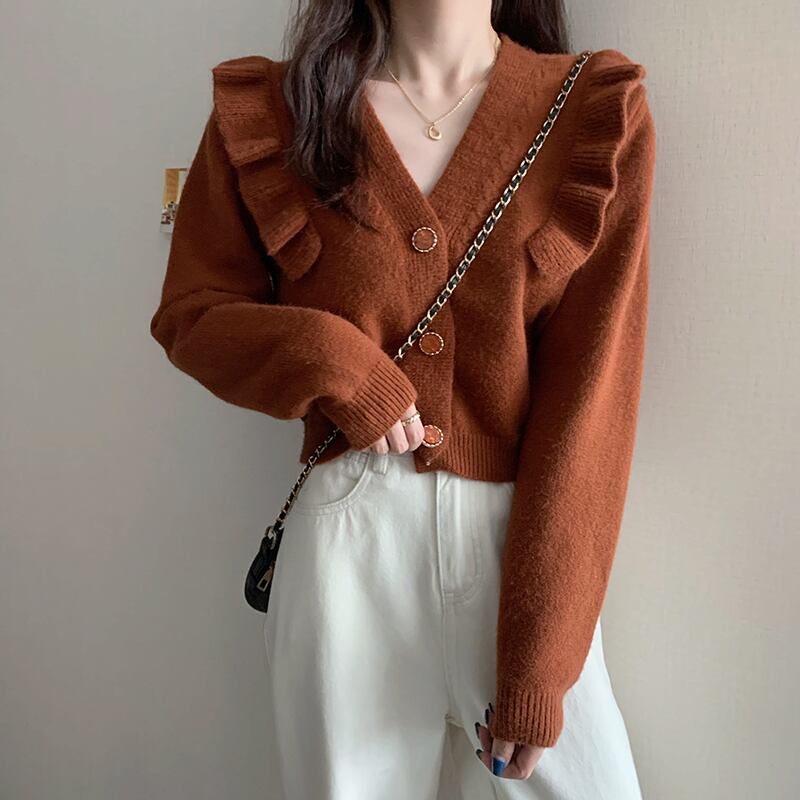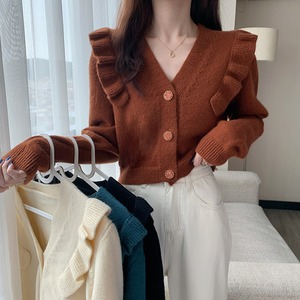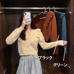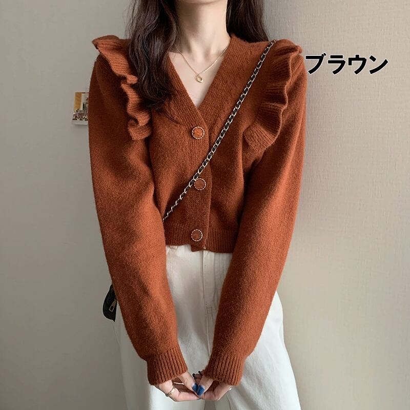 肩のフリルがフェミニンな印象のリブニットカーディガン。