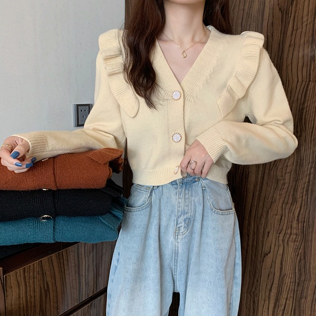レトロ ハイネックセーター レディース 送料無料 4色 フリル Vネック シングルブレスト フレア リブ ニットカーディガン レイヤード フリルクロップ丈 ショート丈 レディース ファッション キャンディスリーブ パフスリーブ ゆったり 大きめ ゆる 楽ちん きれいめ シンプル かわいい 可愛い カジュアル おしゃれ お洒落 こなれ感 抜け感 上品 エレガント 春 春服 夏 夏服 デート 通学 学生 お出かけ 普段使い 着回し 重ね着 無地 単色 体型カバー ガーリー 大人女子 インスタ映え