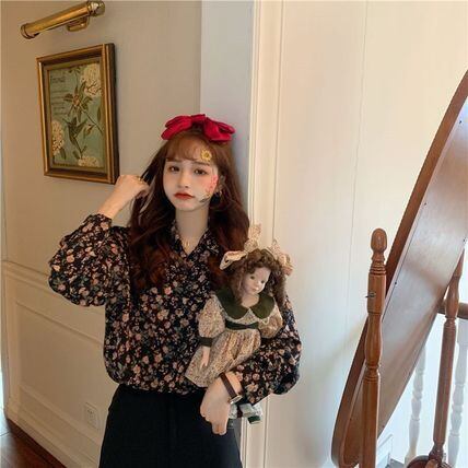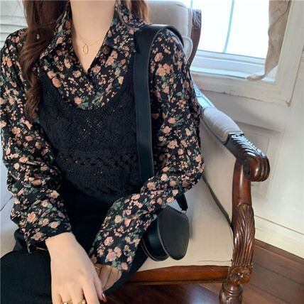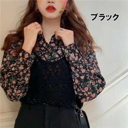 レトロな小花柄シャツにクロシェ編みビスチェのセットアイテムです。