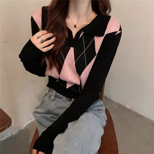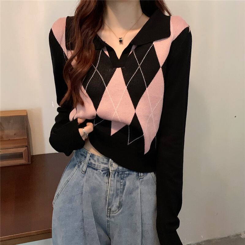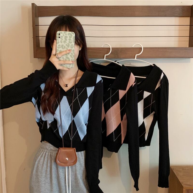 レトロでVネックに襟付きのクロップ丈アーガイルニットです。