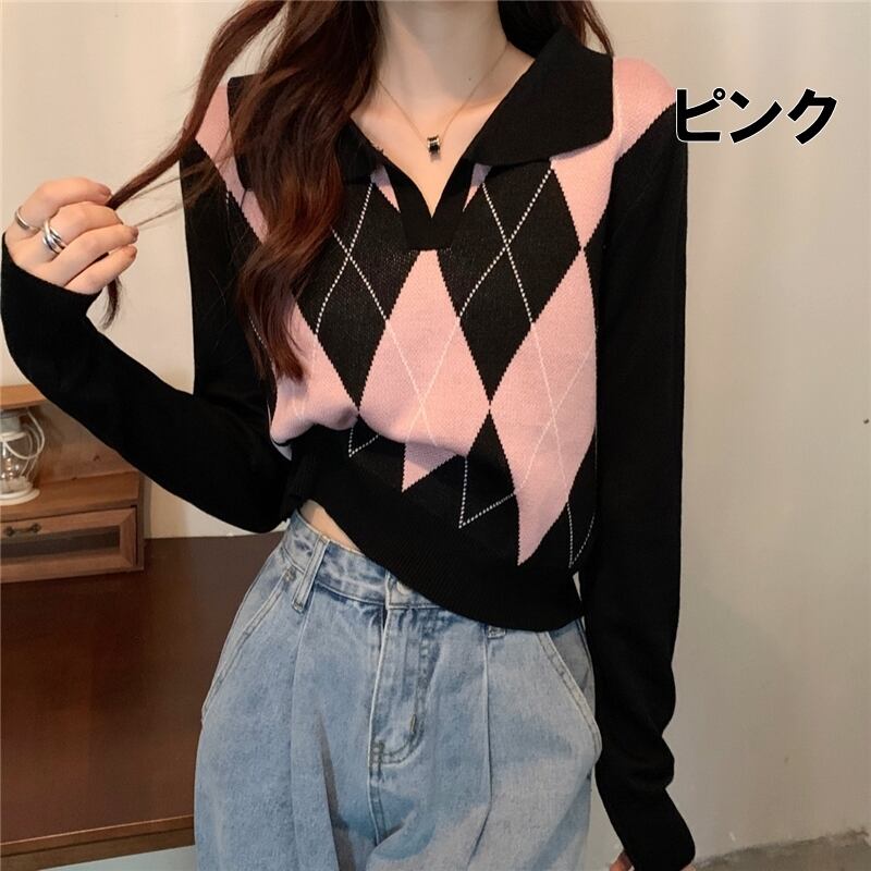 ニット レディース 送料無料 長袖 3色 アーガイル プルオーバー クロップトップ チェック オーバーサイズ ロゴ 襟付き マルチパターン バイカラー Vネック カジュアル ルーズ マルチカラ— 楽チン 体型カバー 足長 水色 オレンジ ホワイト ブラック 10代 20代 デート 通学 おしゃかわ アクティブ ゆるかわ 送料無料