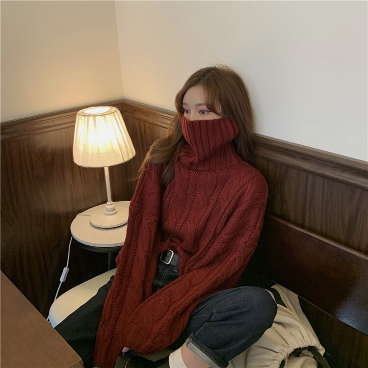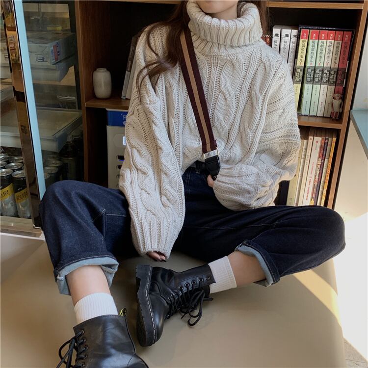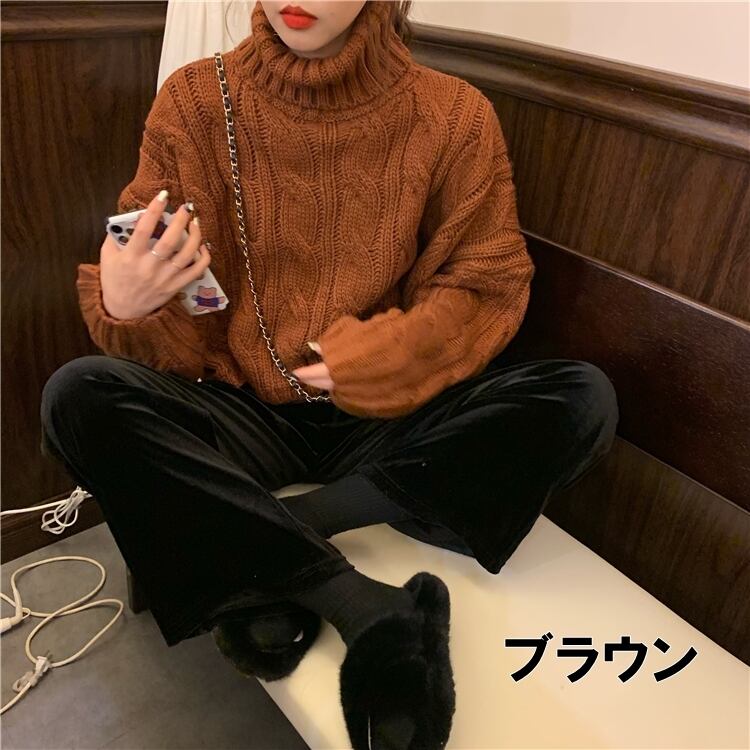 ボリュームたっぷりなケーブル織りが可愛いタートルネックニットです。