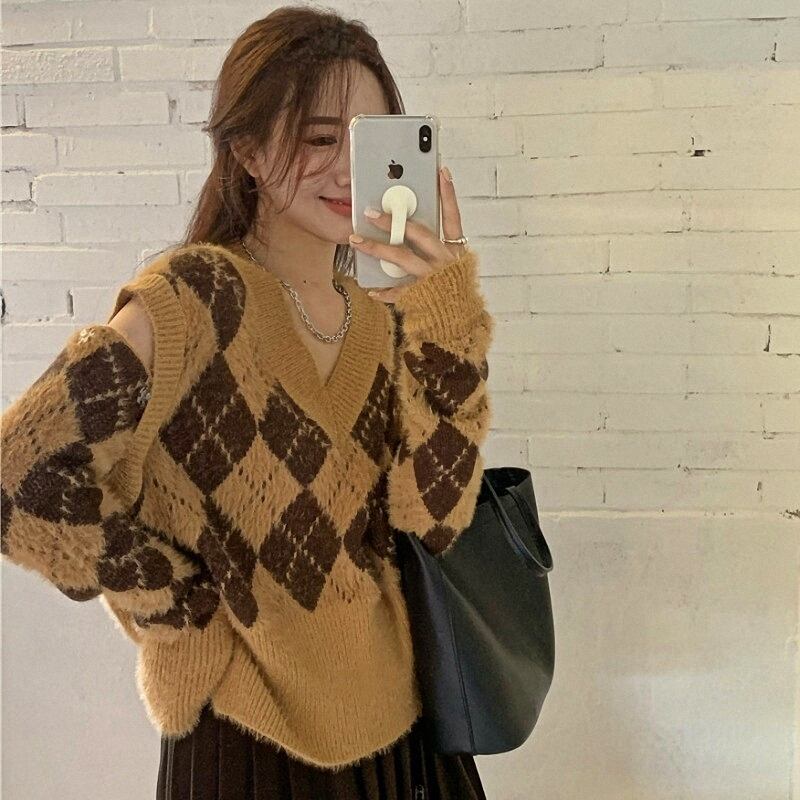 レトロでベーシックな魅力の肌みせが叶うアーガイルニットです。