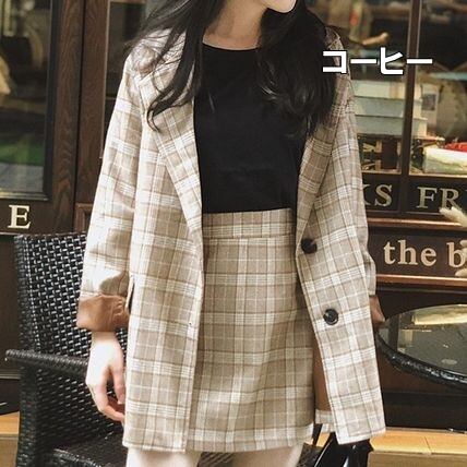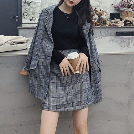 ミディアム丈のレトロなチェックジャケットとミニスカートのセットです。