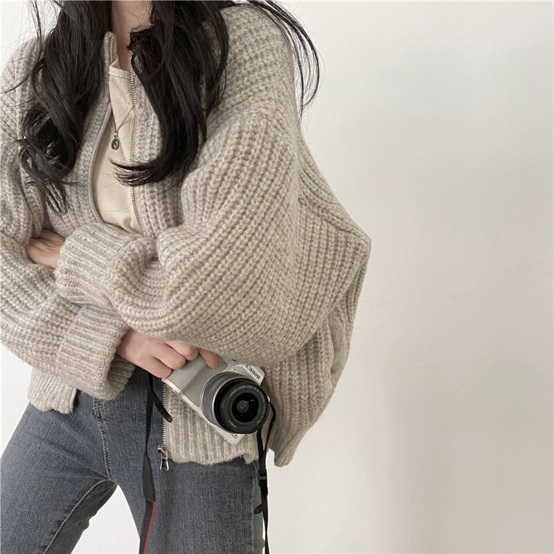 ゆったりシルエットのマニッシュなジップ付きリブニットセーター。