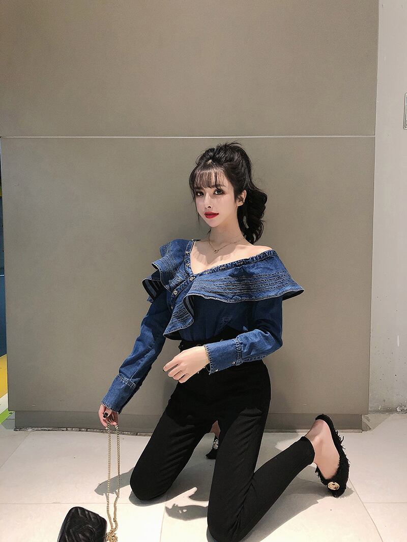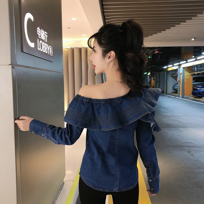 トップス レディース 送料無料 シャツ ブラウス 袖あり オフショルダー長袖 ボリューム袖 パフスリーブ 襟付き ストレート フリル 前開き デニム ブルーデニム 大人可愛い きれいめ シンプル カジュアル 上品 おしゃれ アジアン 大人女子 こなれ感 クール モード系 エレガント モダン 存在感 M L XL 2XL 3XL 4XL 大きいサイズ ゆったり 青 ブルー 水色 無地 春 秋 冬 10代 20代 オフィス ビジネス OL デート お出かけ 休日 イベント 普段使い 韓国系 オルチャン