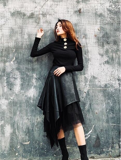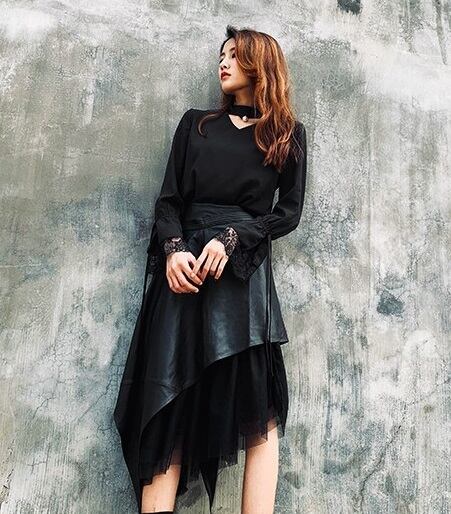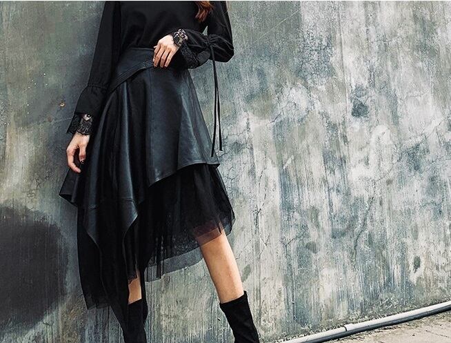 スカート レディース 送料無料 ブラック サイズ4展開 S M L XL レザー調 フェイクレザー 異素材ミックス アシンメトリー レザースカート ミモレ丈 レース 透け感 おしゃれ ハイセンス デイリー 日常 お出かけ デート ランチ 女子会 通勤 休日 エレガントスタイル 個性的 カッコいい 20代 30代 40代 春 夏 秋 冬 オールシーズン 韓国ファッション 韓国 オルチャン