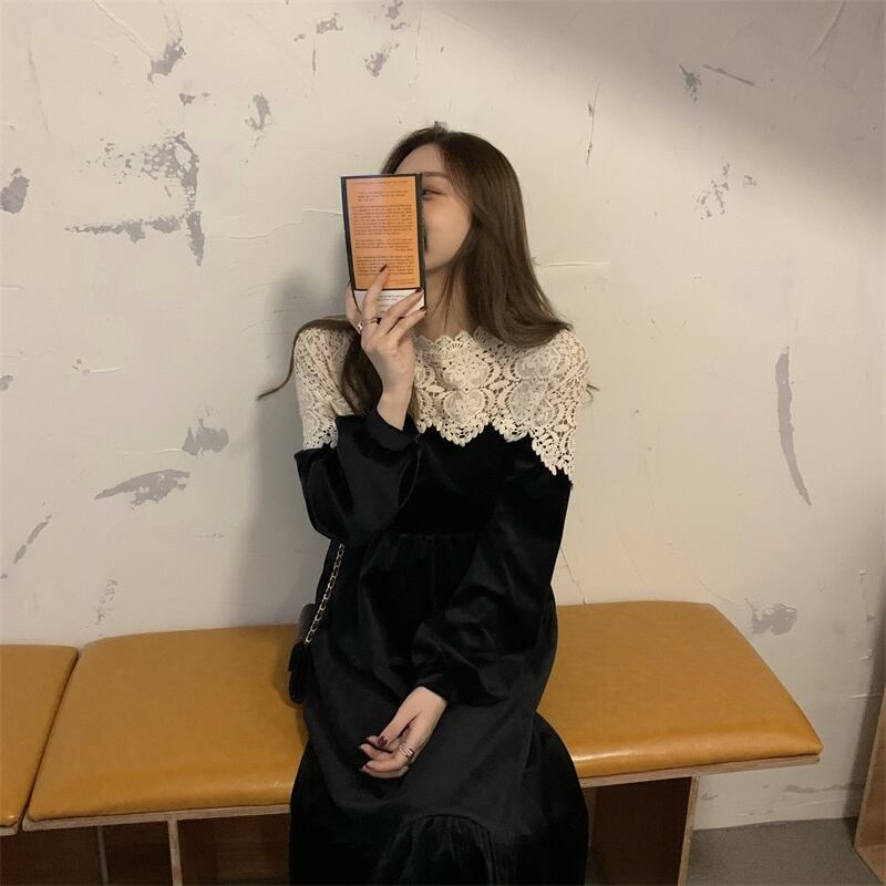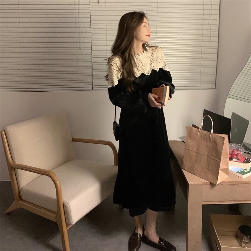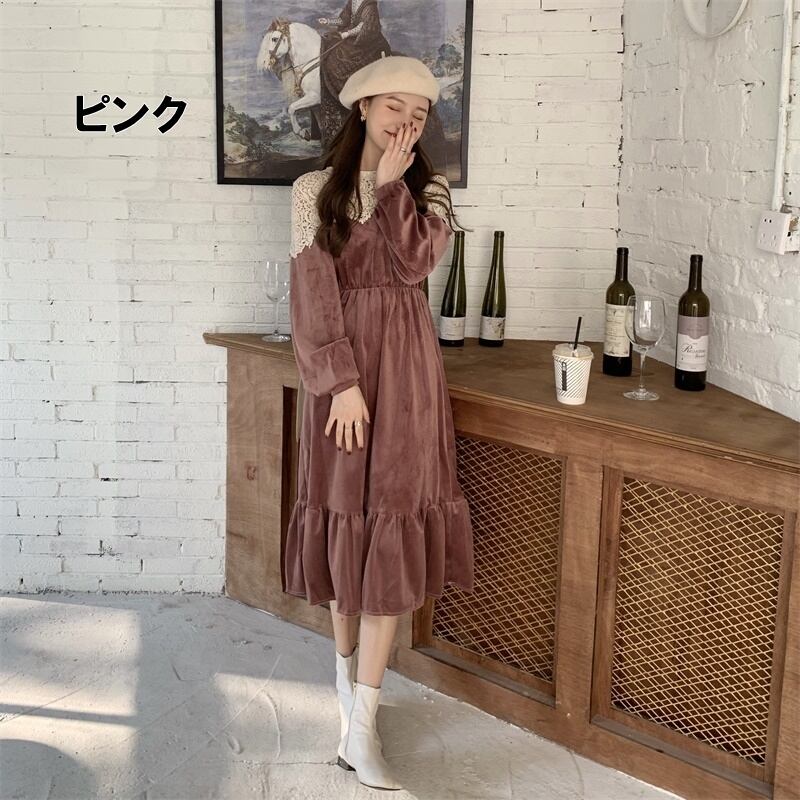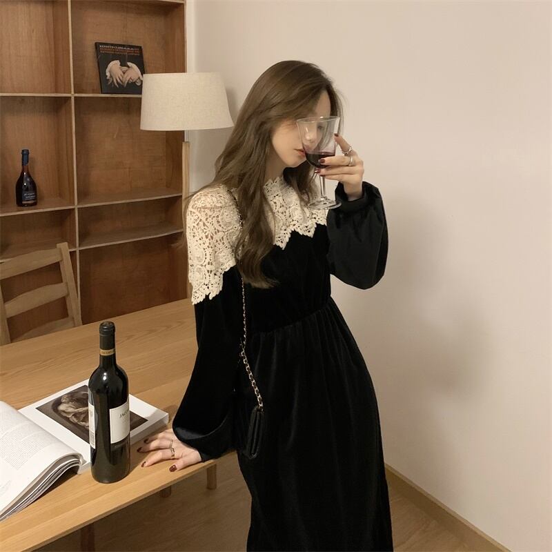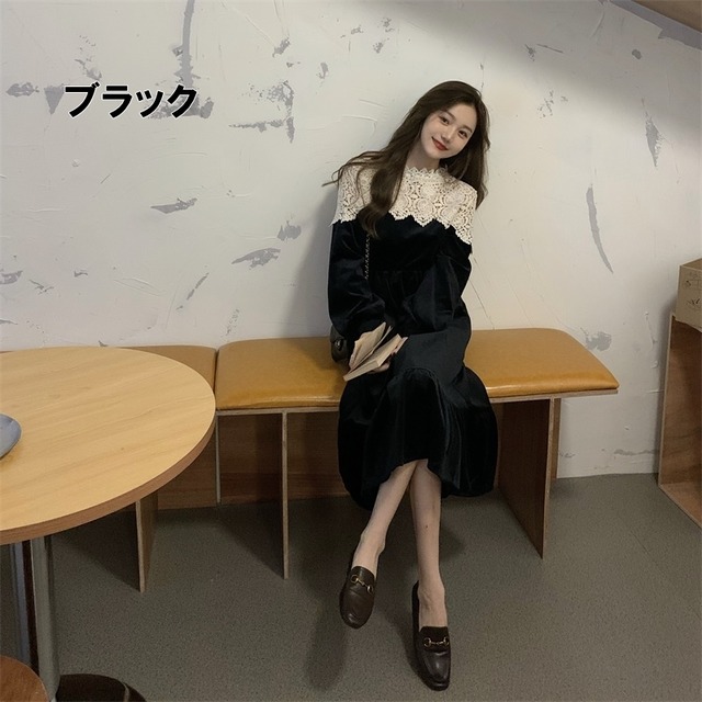 ワンピース レディース 送料無料 2色 ベルベット ピーチスキン クルーネック ティアードワンピース シャツワンピース レース バイカラー ウエストマーク ハイウエスト ロング丈 Aライン 襟付き 前開き フロントボタン長袖 ハイウエスト ウエストゴム ウエストマーク 体型カバー 脚長 細見え 華奢見え 二の腕カバー ブラック 黒色 花柄 ボタニカル柄 フラワー 抜け感 こなれ感 フェミニン 大人可愛い かわいい きれいめ 大人女子 上品 エレガント おしゃれ お洒落 春服 20代 30代 40代