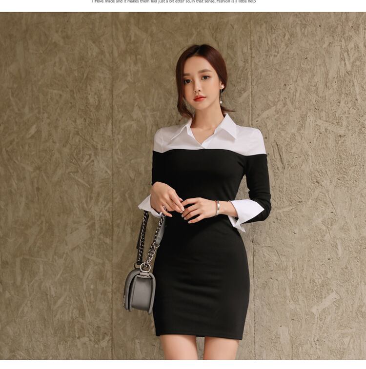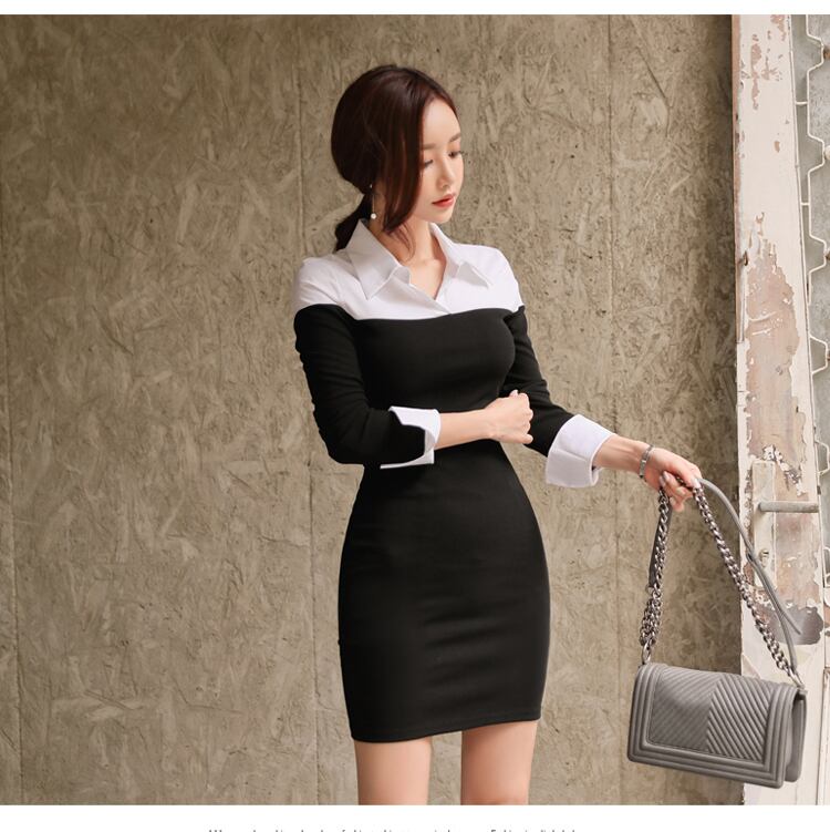 カジュアルで上品なワイシャツにブラックのボディコンシャスワンピのアシンメトリーがセクシーな一着。