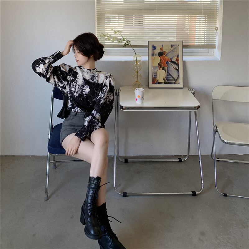 トップス レディース 送料無料 ブラック サイズ4展開 S M L XL プルオバー シャツ ブラウス 長袖 かっこいい おしゃれ 黒 マーブル 模様 ラウンドネック ボリューム袖 プリント きれいめ カジュアル 主役級 ルーズ ファッション 春 秋 10代 20代 30代 モノトーン デート 女子会 ランチ オフィススタイル 韓国 オルチャン 韓国ファッション
