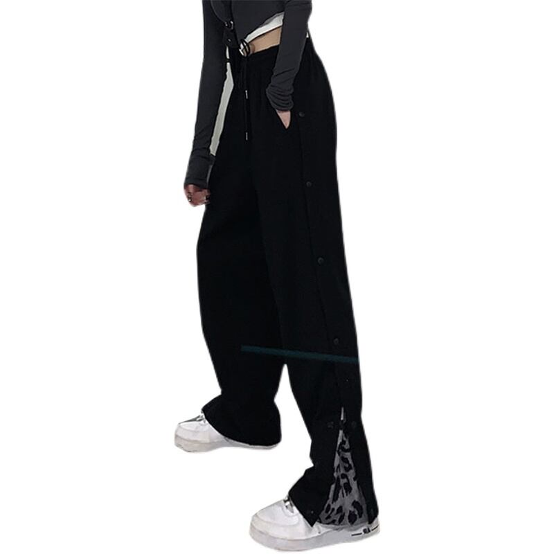 ボトムス レディース 送料無料 ブラック サイズ6展開 M L XL 2XL 3XL 4XL 大きいサイズ パンツ ワイド カジュアル ヒョウ柄 かっこいい クール ルーズ マニッシュ ハイウエスト モノトーン 黒 調節 ボタン サイド 切り替えデザイン バイカラー リラックス おしゃれ スポーツ 10代 20代 30代 ウエストゴム 韓国 オルチャン 韓国ファッション