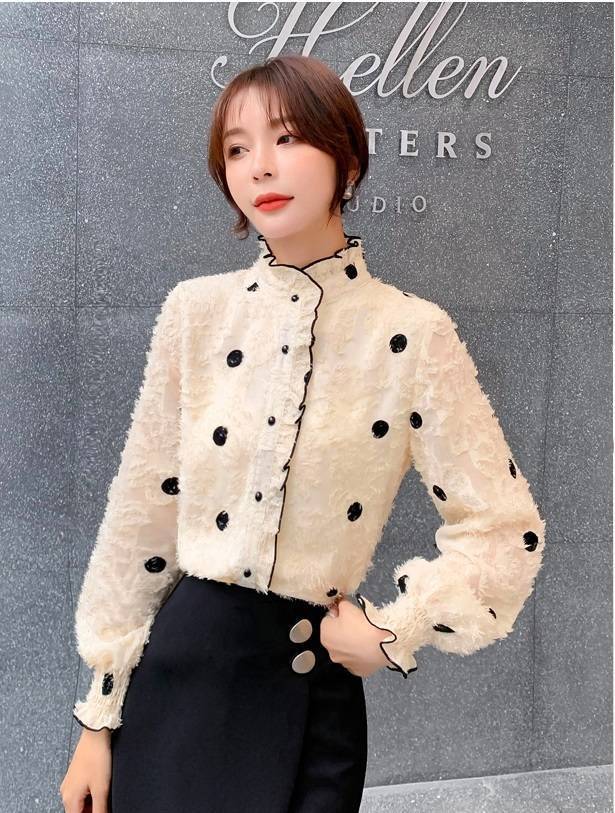 トップス レディース 送料無料 ブラウス シャツ シャギー ドット フリル ラインストーン ビジューボタン フォギー 起毛 長袖 襟付き シフォン レース スタンドカラー プチハイネック 透け感 シアー シースルー ポリエステル ホワイト 白 アプリコット 単色 透け感 こなれ感 抜け感 ガーリー かわいい 可愛い 涼しい 上品 エレガント きれいめ ラブリー 女の子 お洒落 おしゃれ 春 春服 夏 夏服 デート おでかけ モテ 女子会 普段使い 着回し 重ね着 定番 韓国 韓国系 オルチャン