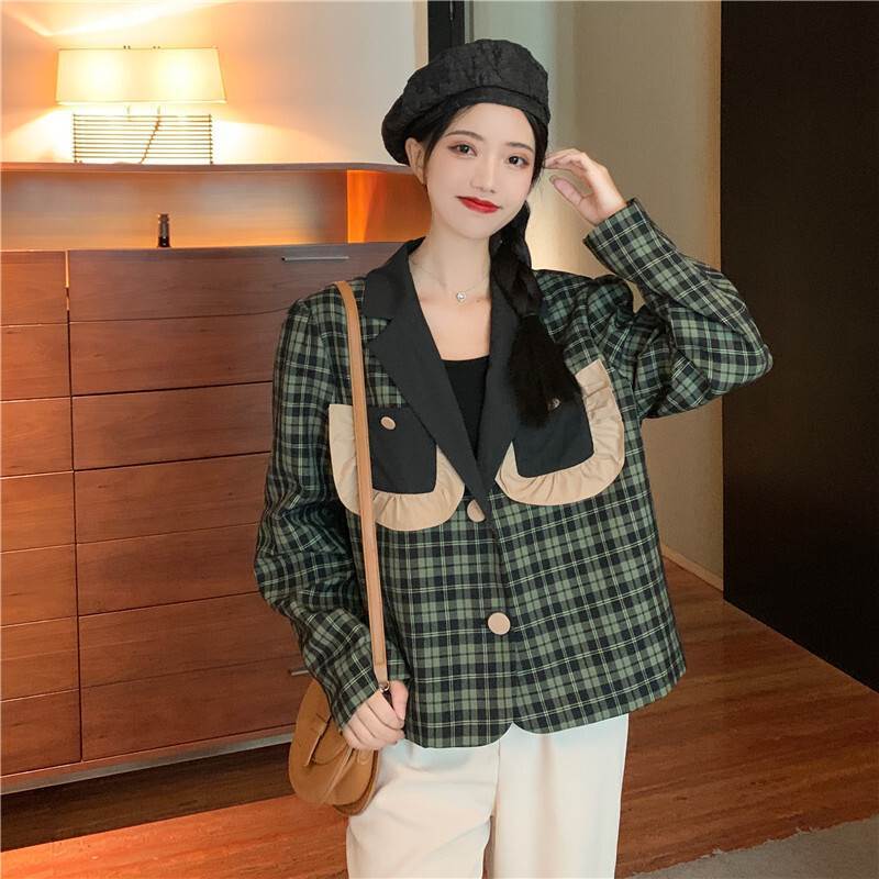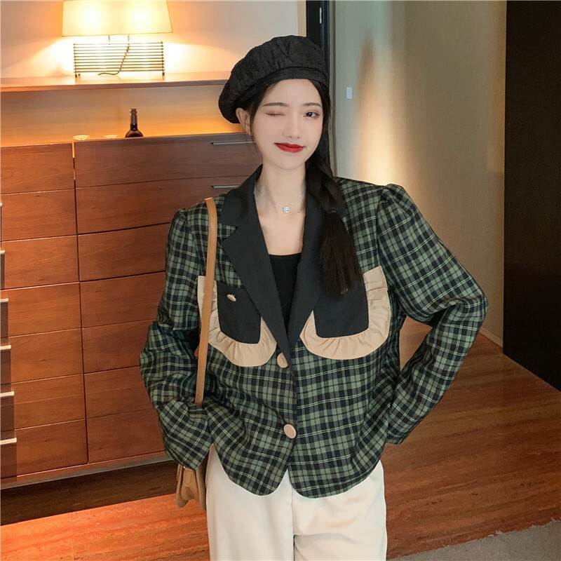 くすみカラーのチェックがレトロでクラシカルな短め丈ジャケットです。