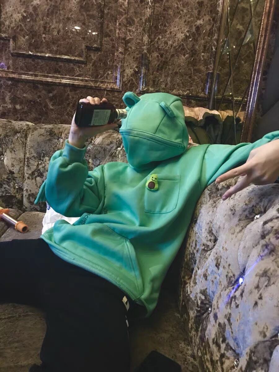 カエルの目と水かきモチーフ付きの遊び心溢れるデザインが可愛パ―カーです。