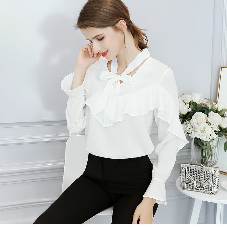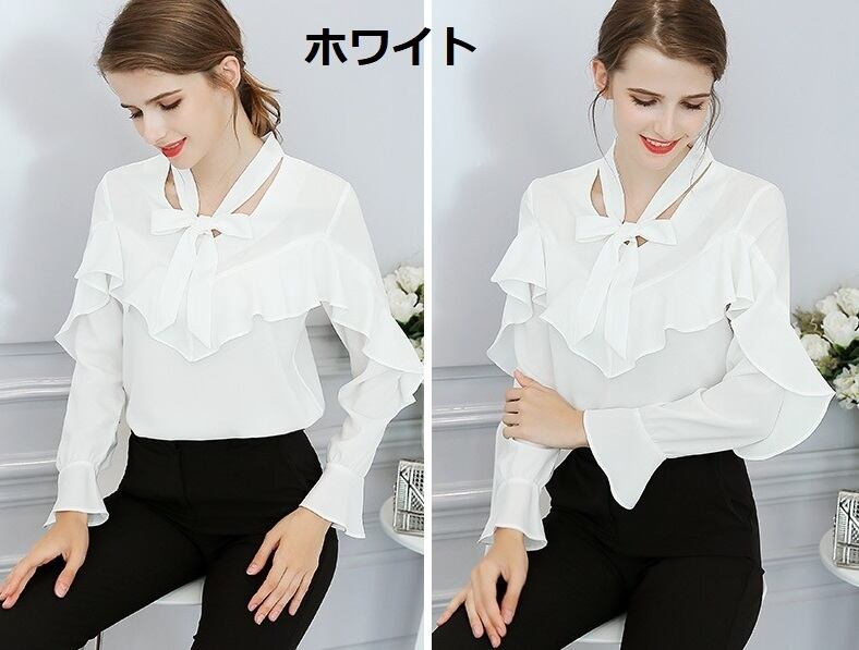 トップス レディース 送料無料 カラバリ3色 ライトブルー ホワイト ピンク サイズ5展開 S M L XL 2XL シャツ ブラウス フレンチ レトロ フリル 長袖 春 秋 10代 20代 30代 40代 シフォン プルオーバー リボン ボウタイ 大きいサイズ とろみ感 こなれ感 おしゃれ きれいめ トップス コーデ きれいめ エレガンススタイル 上品 オフィススタイル