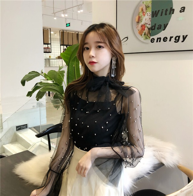 トップス レディース 送料無料 カラバリ2色 アプリコット ブラック ワンサイズ シャツ ブラウス かわいい プルオーバー ビジュー リボン 長袖 無地 フリル ボリューム袖 チュール 透け感 きれいめ コーデ 大人 エレガント パール お呼ばれ スタイル おしゃれ トップス 主役級 春トップス 夏 OL オフィススタイル ビジネスシーン エレガンススタイル