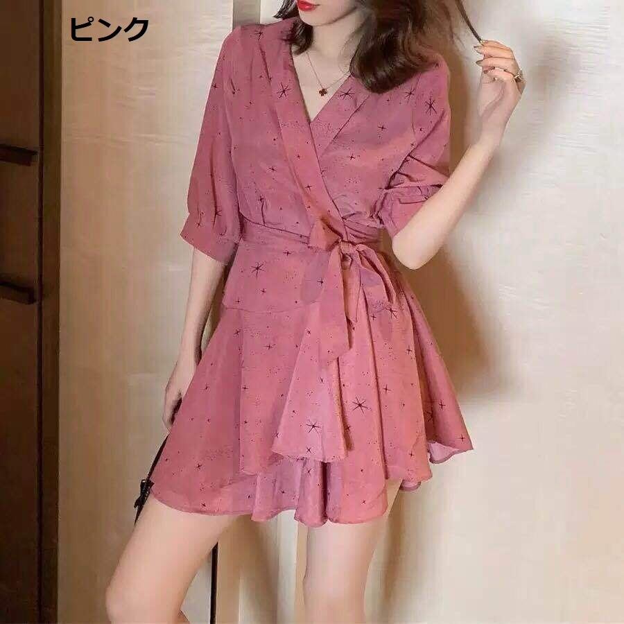 ワンピース レディース 送料無料 カラバリ2色 アプリコット ピンク サイズ3展開 S M L シフォン 透け感 ミニ スカート フレア カシュクール 袖あり 春 夏 秋 10代 20代 膝上 膝丈 ミニ丈 パステルカラー 七分袖 リボン ウエストマーク Vネック 透け感 シースルー ハイウエスト 華やか ミニ丈 ショート丈 ミニワンピ Vネック