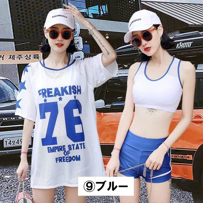 ラッシュガードタイプのスポーティーな水着とTシャツの3点セットです。