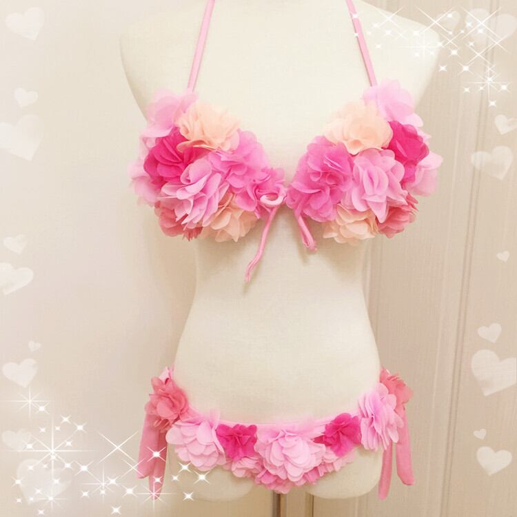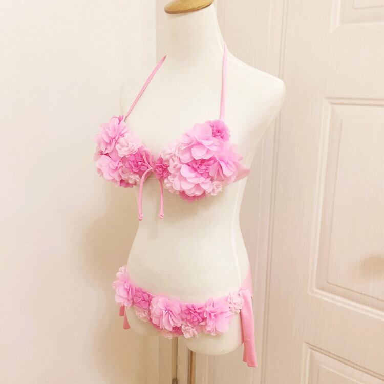 花びらを集めたようなふんわり立体にシフォンをあしらったビキニセットです。