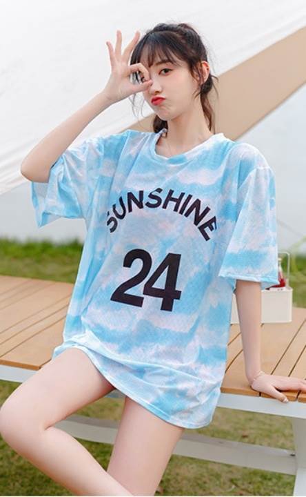 ラッシュガードタイプのスポーティーな水着とTシャツの3点セットです。