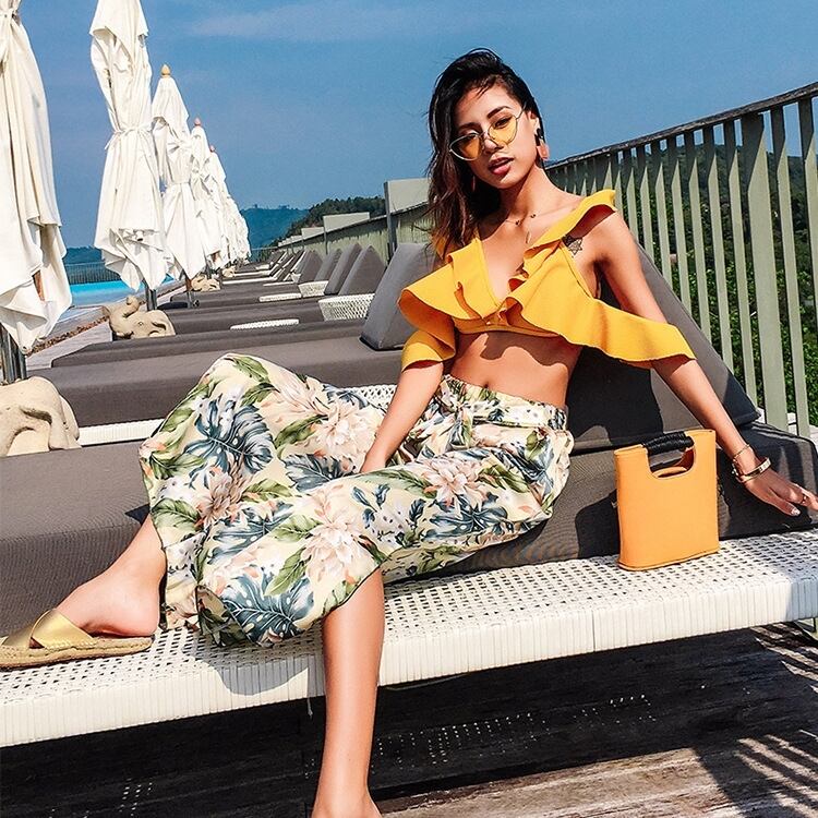 フリルが可愛いビキニとカジュアルなアンクルパンツの3点セットです。