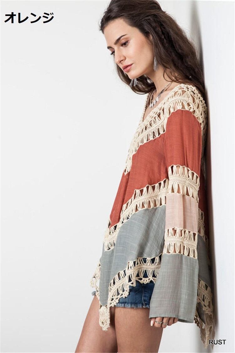 トップス レディース 送料無料 カラバリ2色 ネイビー オレンジ ワンサイズ サイズフリー シャツ ブラウス きれいめ 個性的 エスニック 長袖 韓国 春 夏 秋 10代 20代 30代 40代 ニュアンスカラー Vネック レース ステッチ プルオーバー くすみカラー 袖あり ラフ感 こなれ感 大きめ ゆったり ルーズ感 水着 プール 海