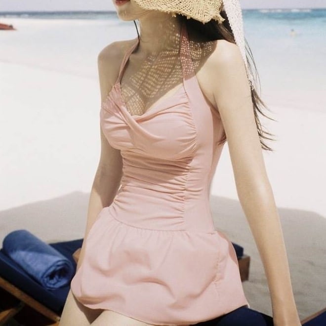 バストとウエストにかけたギャザー仕立てで着やせ効果に期待できるワンピース水着です。