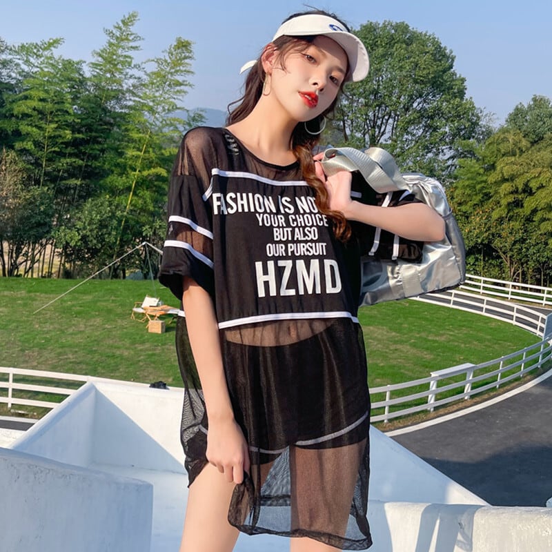 ラッシュガードタイプのスポーティーな水着とTシャツの3点セットです。