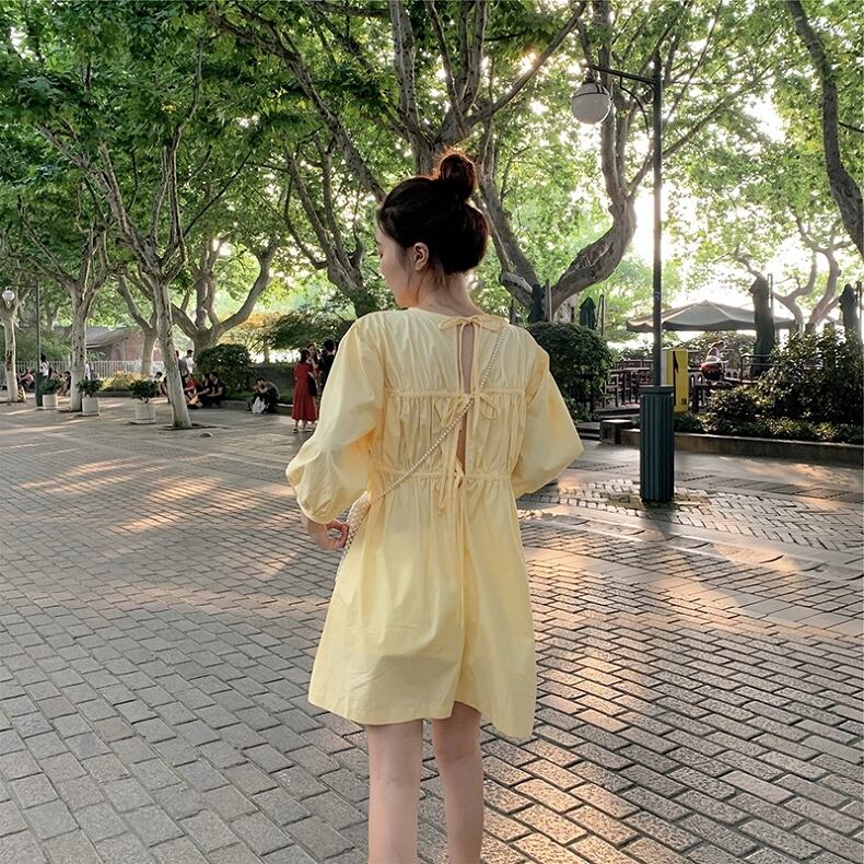 ワンピース ひざ丈 膝上 袖あり 5分袖 五分袖 ボリューム袖 パフスリーブ ラウンドネック 襟なし ノーカラー ワイド リボン ギャザー バックリボン 透け感 薄手 かわいい シンプル カジュアル おしゃれ お洒落 レトロ こなれ感 ラフ ラブリー ラブリー キュート ガーリー ルーズ 個性的 存在感 抜け感 ベーシック 無地 春 夏 20代 30代 レディース 女性用 OL デート お出かけ 女子会 休日 パーティー イベント リゾート 旅行 海 ショッピング 合コン コンパ 普段使い ヘビロテ