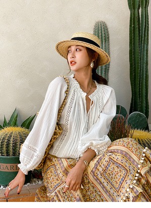 薄手なので春夏秋に使えるエスニック感がプラスされたおしゃれなブラウス。春夏のレディースファッションには、白シャツを取り入れると華やかで清潔感あふれる印象になるので持っておきたい一枚です。白を基調としたトップスには、コーディネートも限りなく広がります。