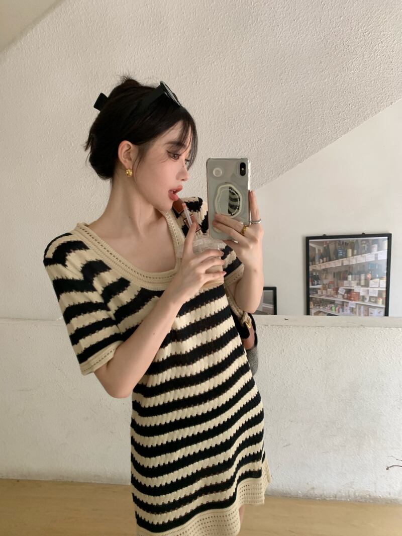 ワンピース ニットワンピース ショート ショート丈 袖あり 半袖 Uネック 襟なし ノーカラー ストレート バイカラー 配色 ニット かわいい カジュアル おしゃれ お洒落 レトロ こなれ感 ラフ キュート ルーズ 主役級 存在感 抜け感 ボーダー 夏 10代 20代 30代 レディース 女性用 ママ 女の子 OL 学生 デート お出かけ 休日 イベント リゾート 旅行 海 プール ショッピング 着回し 普段使い 重ね着 レイヤード 楽ちん 体型カバー 定番 フリーサイズ ゆったり ブラック ベージュ