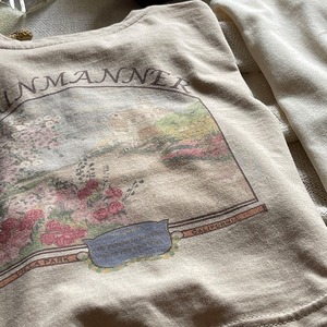 背中に絵画を描いたようなヴィンテージライクのデザインの、落ち着きのあるカラーリングが大人っぽさを感じさせてくれるTシャツ。フロントは極々シンプルなデザインに。ベースボールカラーのような襟元がカジュアル感をアップしてくれます。