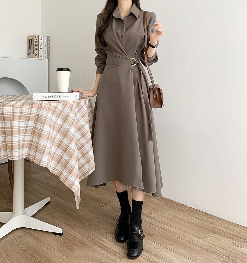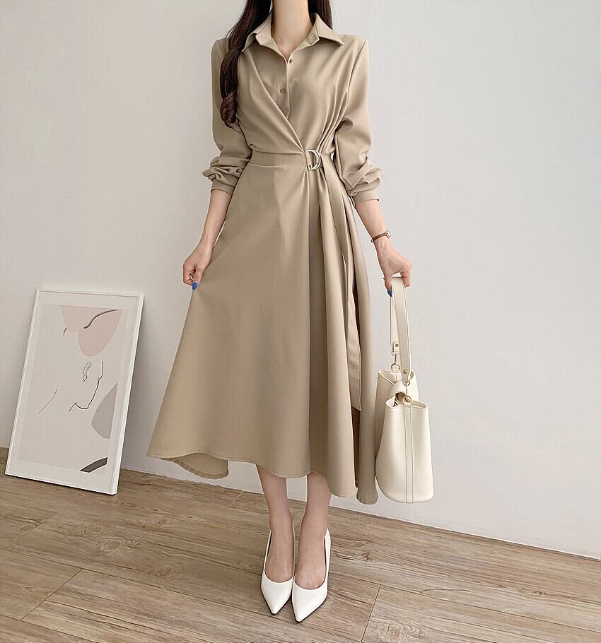 カーキ、アプリコット、ブラックの3色から選べるシャツワンピースです。上品で可愛らしいデザインが女性の魅力を引き立てます。春秋のおしゃれな着こなしにぴったりのワンピースです。Aラインのシルエットがスタイルアップや美脚効果も期待できます。