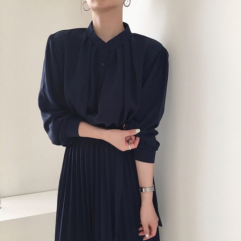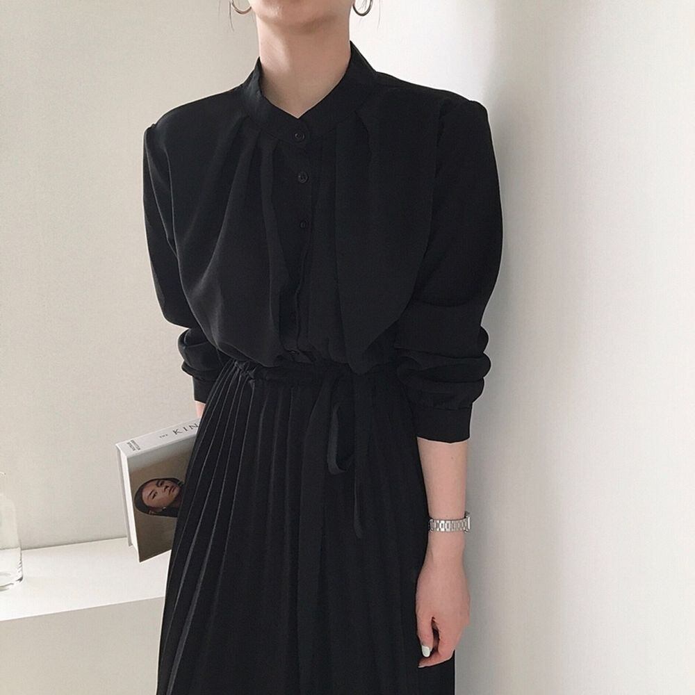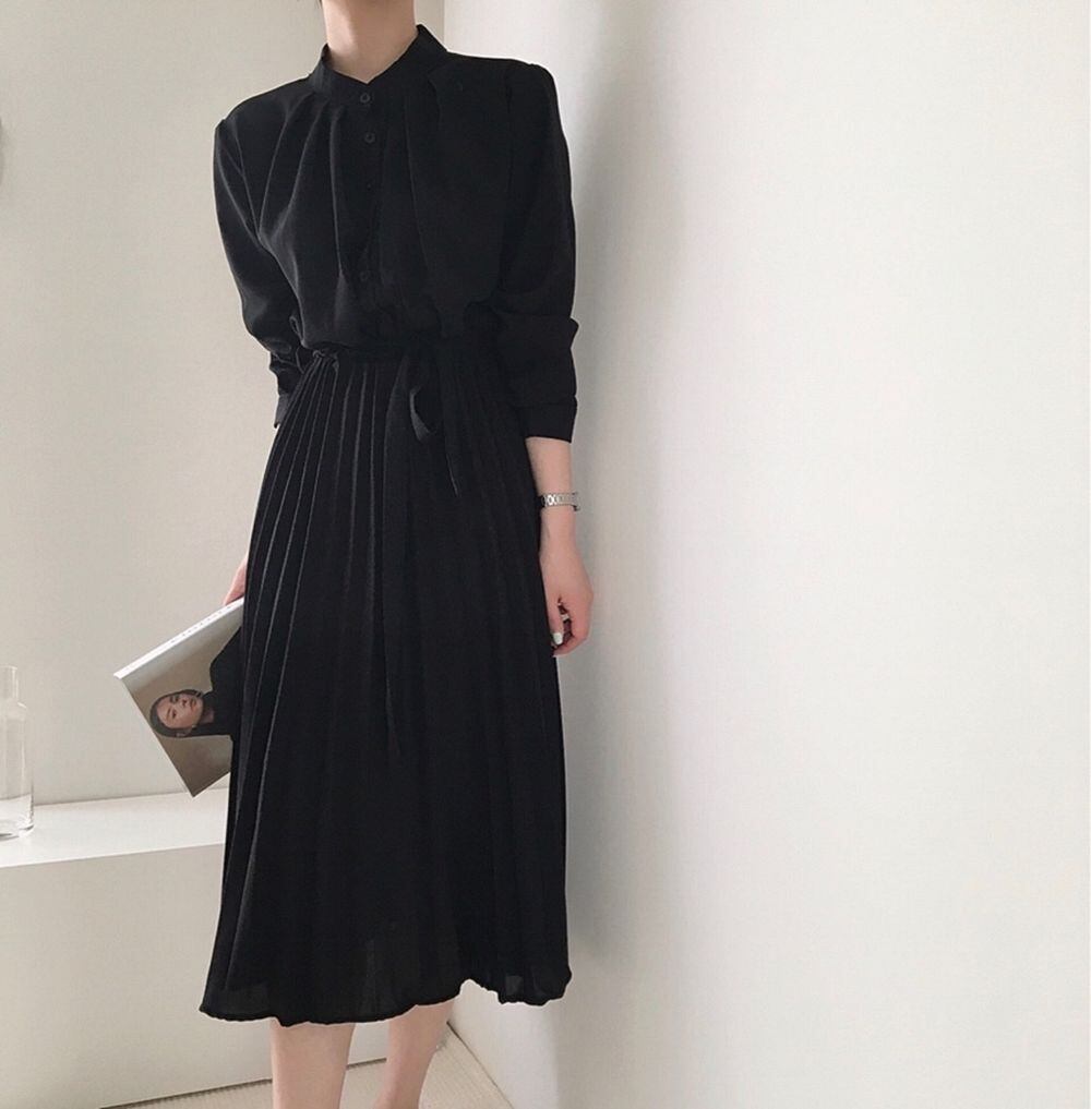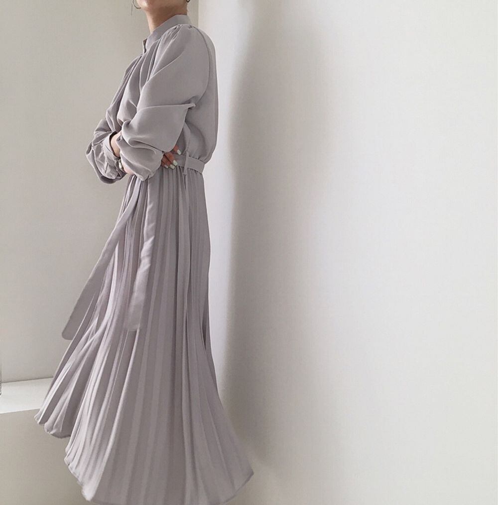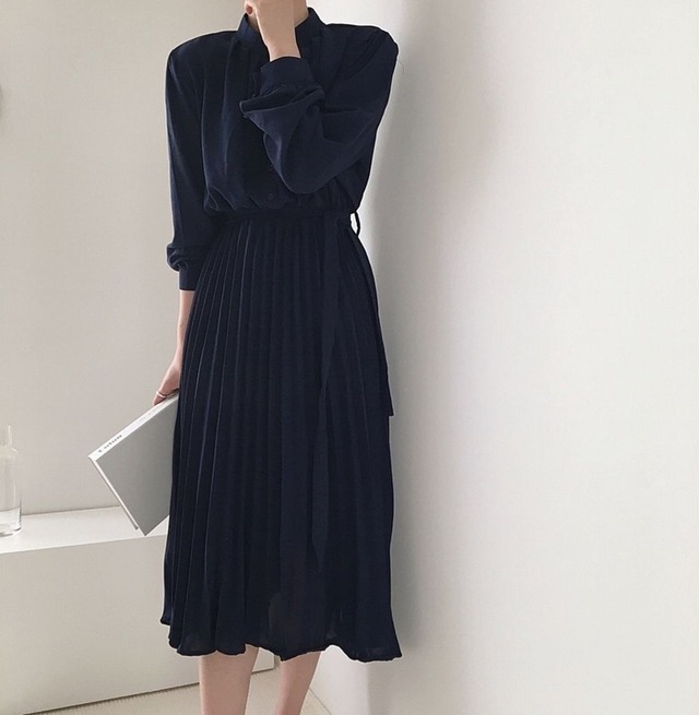 ミモレ丈ワンピース グレー ネイビー ブラック ワンピース ミモレ ミモレ丈 袖あり 長袖 襟付き プリーツ リボン ウエストマーク ウエストリボン ハイウエスト お得 かわいい 大人可愛い きれいめ 大人 上品 おしゃれ お洒落 清楚 大人女子 ラブリー キュート ガーリー 存在感 無地 春 秋 10代 20代 30代 40代 レディース 女性用 学生 デート お出かけ 女子会 休日 ホテル レストラン お呼ばれ ランチ ショッピング 着回し 普段使い モテ 脚長 細見え スタイルアップ S M L