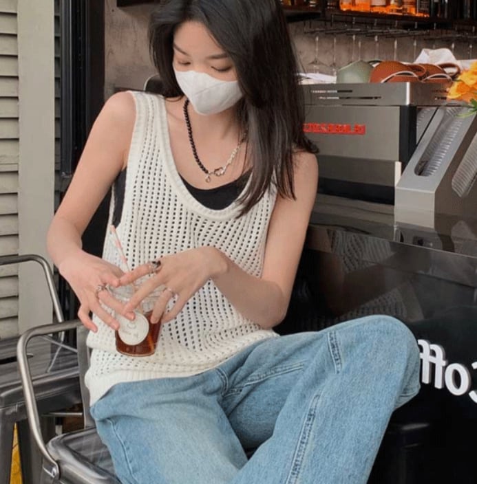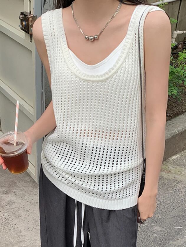 ニットベスト トップス ニットソー ベスト 白トップス 袖なし ノースリーブ Uネック 襟なし 透け感 ニット かわいい 大人可愛い 大人 おしゃれ お洒落 アジアン エスニック 大人女子 こなれ感 ラブリー キュート 存在感 抜け感 爽やか 無地 春 夏 秋 ロングシーズン 10代 20代 30代 40代 レディース 女性用 学生 デート お出かけ 女子会 休日 ランチ 着回し 普段使い 重ね着 モテ S M ゆったり ゆる ホワイト