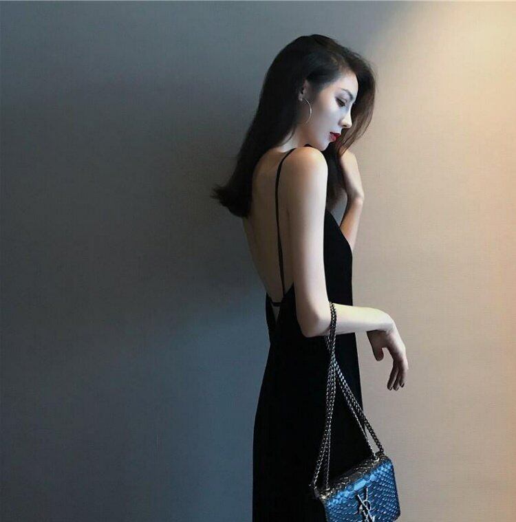 背中が深く開いてるドレス。袖なしでキャミソール風のデザインで、肩のラインが美しく見えます。ネックラインはシンプルな襟なしなので、アクセサリーをなんでも合わせやすいです。サイドスリットが入っているので、足のラインも綺麗に見えます。
