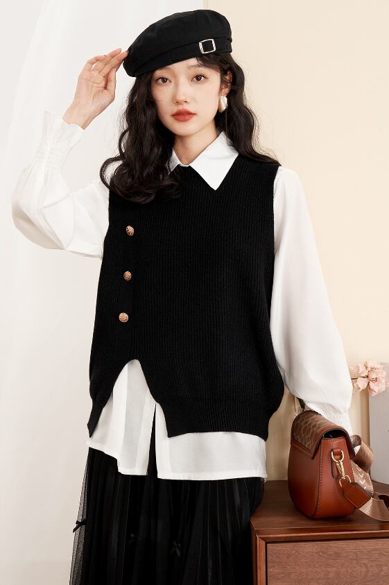 トップス シャツ ブラウス ベスト 袖なし 袖あり ノースリーブ 長袖 ラウンドネック 襟付き ニット 2点セット ツーピース お得 かわいい 大人可愛い 大人 おしゃれ お洒落 ラブリー キュート 存在感 抜け感 無地 春 秋 冬 ロングシーズン 10代 20代 30代 レディース 女性用 学生 デート お出かけ 女子会 レストラン ランチ ショッピング 着回し 普段使い 重ね着 韓国 韓国系 S M L XL ブラック グレー