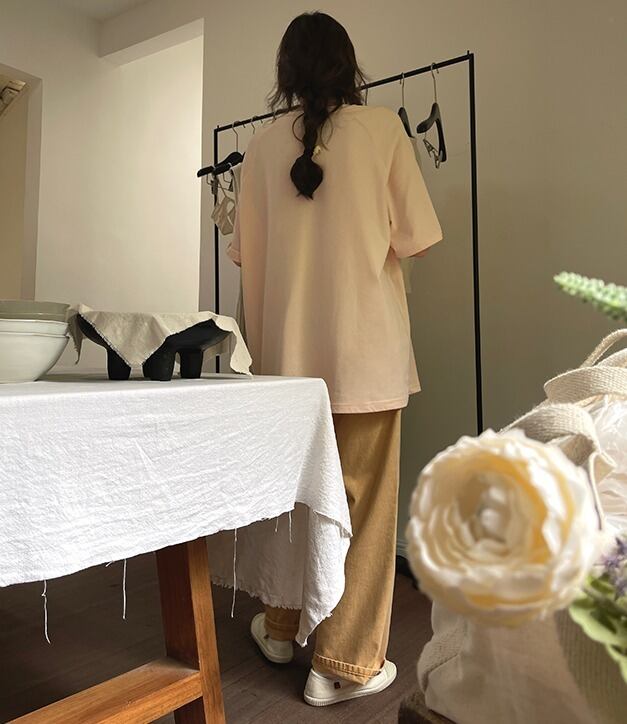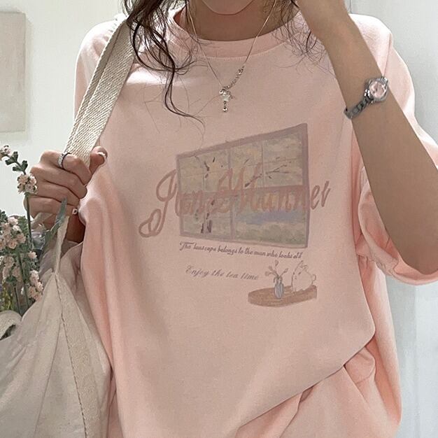 Tシャツ ビッグT ミディアム丈 ミドル丈 袖あり 5分袖 五分袖 ラウンドネック 襟なし ノーカラー ストレート ワイド かわいい シンプル おしゃれ お洒落 レトロ ヴィンテージ こなれ感 ラフ ラブリー キュート ガーリー ルーズ 個性的 学生風 プリント 夏 10代 20代 30代 レディース 女性用 女の子 学生 お出かけ 休日 運動 スポーツ ダンス イベント ショッピング 着回し 普段使い 楽ちん 体型カバー ゆる ピンク