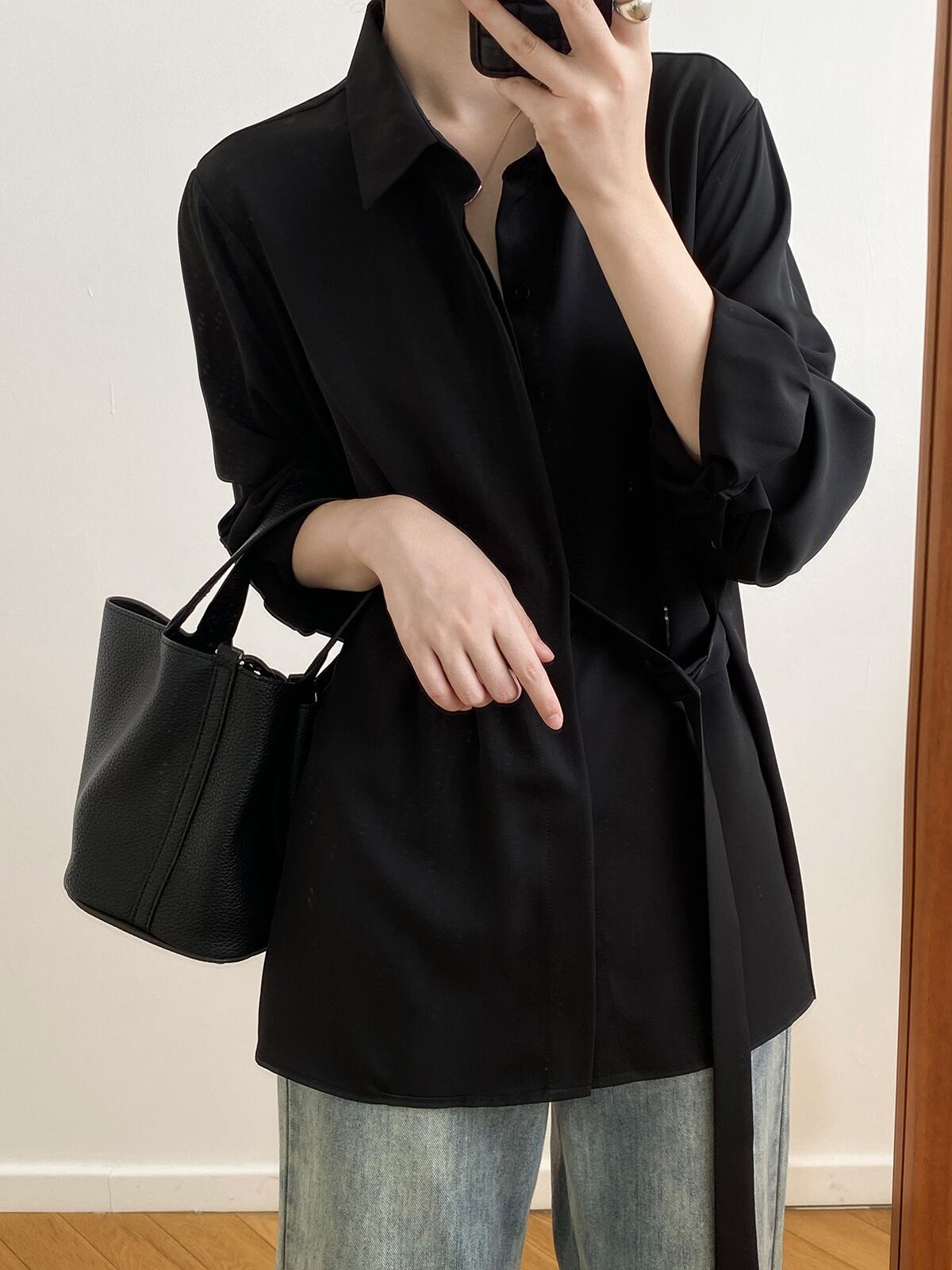 トップス シャツ ブラウス 白シャツ 白トップス 袖あり 長袖 ドロップショルダー 襟付き ベルト ウエストマーク 前開き お得 かわいい 大人可愛い 大人 上品 おしゃれ お洒落 大人女子 個性的 存在感 フォーマル 抜け感 無地 春 秋 20代 30代 40代 50代 レディース 女性用 オフィス ビジネス OL 通勤 ホテル レストラン お呼ばれ 着回し 重ね着 モテ 体系カバー 二の腕カバー M L ホワイト ブラック ブラウン