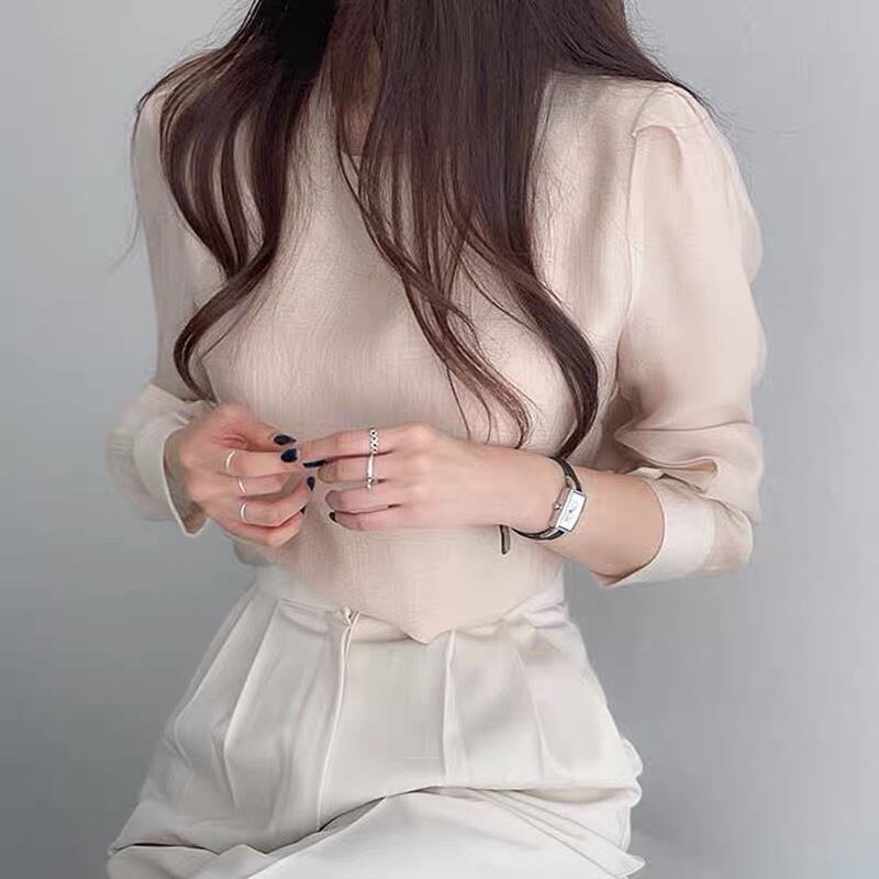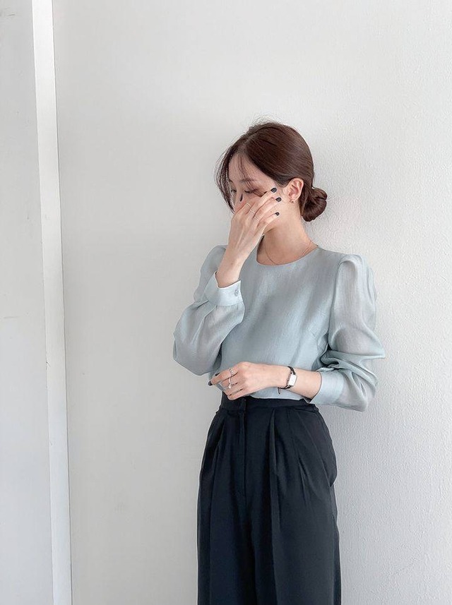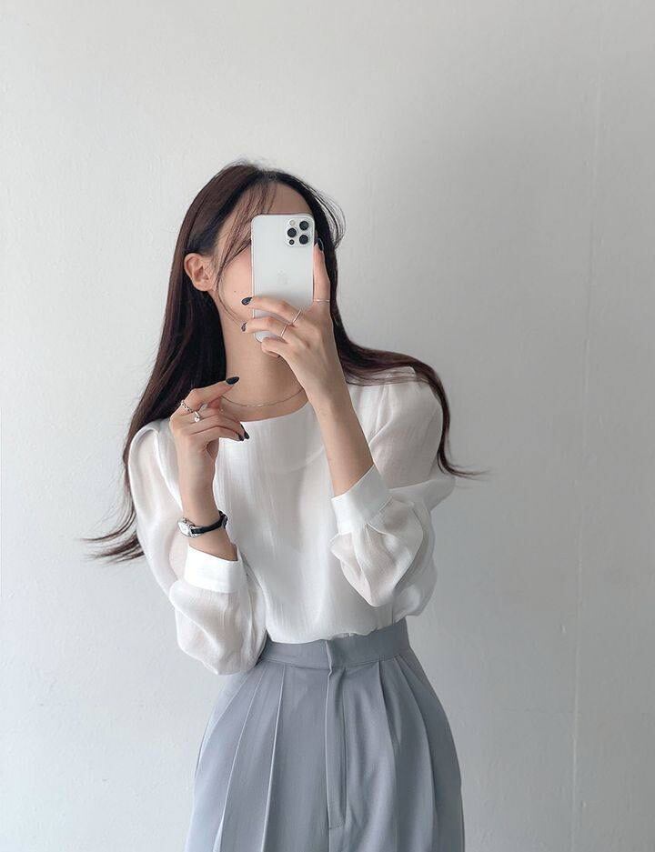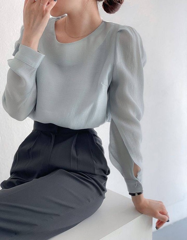トップス シャツ ブラウス 袖あり 長袖 パワーショルダー ラウンドネック 襟なし 透け感 シースルー お得 かわいい 大人可愛い きれいめ 大人 上品 おしゃれ お洒落 大人女子 エレガント 存在感 無地 春 夏 秋 ロングシーズン 20代 30代 40代 50代 レディース 女性用 オフィス ビジネス OL 通勤 ホテル レストラン お呼ばれ 着回し 重ね着 モテ 二の腕カバー S M L XL ホワイト グリーン アプリコット