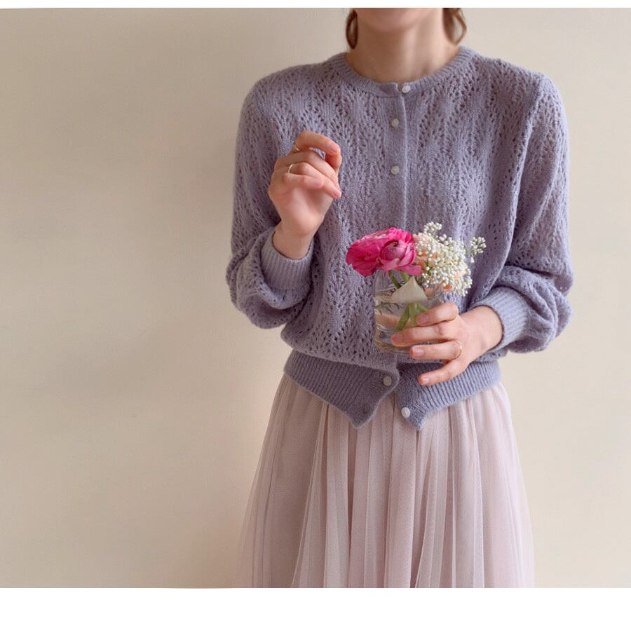 透かし編みニット トップス カーディガン 袖あり 長袖 ラウンドネック 襟なし 前開き 透け感 お得 かわいい 大人可愛い 大人 おしゃれ お洒落 大人女子 ラブリー キュート ガーリー 存在感 無地 春 夏 秋 ロングシーズン 10代 20代 30代 レディース 女性用 ママ 学生 デート お出かけ 女子会 休日 イベント ホテル レストラン ランチ お呼ばれ ショッピング 着回し 普段使い 重ね着 モテ フリーサイズ パープル オフホワイト