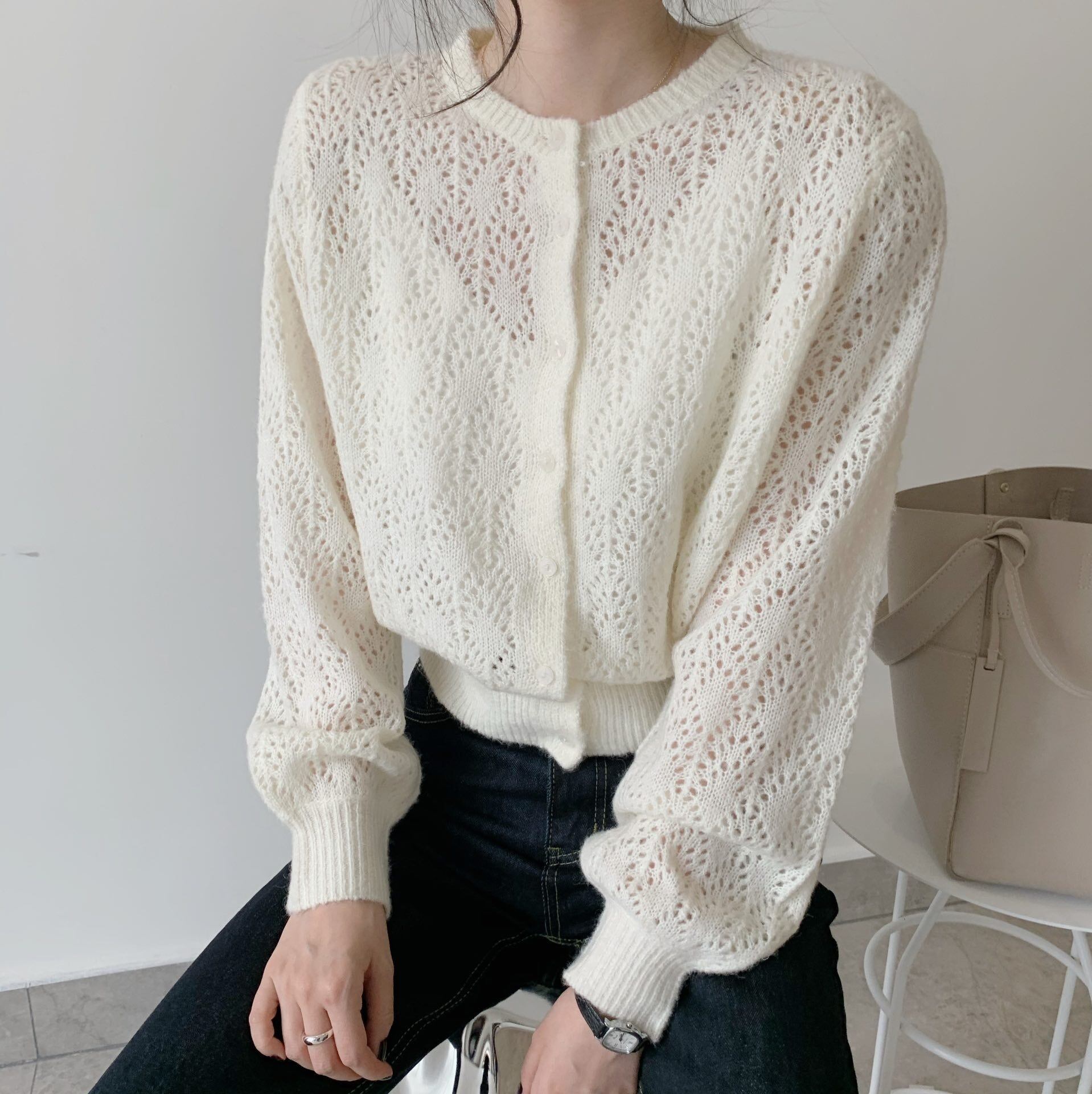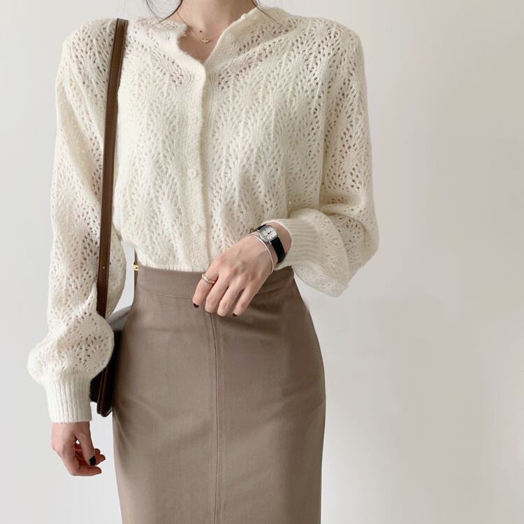 透かし編みのデザインが印象的なカーディガン。袖ありながらも、軽くて着心地が良く、春から秋まで長く活躍してくれます。無地でシンプルなデザインなので、コーディネートもしやすく、重ね着スタイルにもぴったりです。