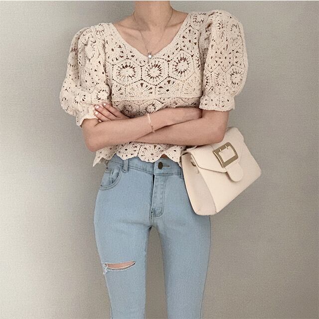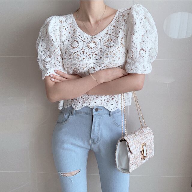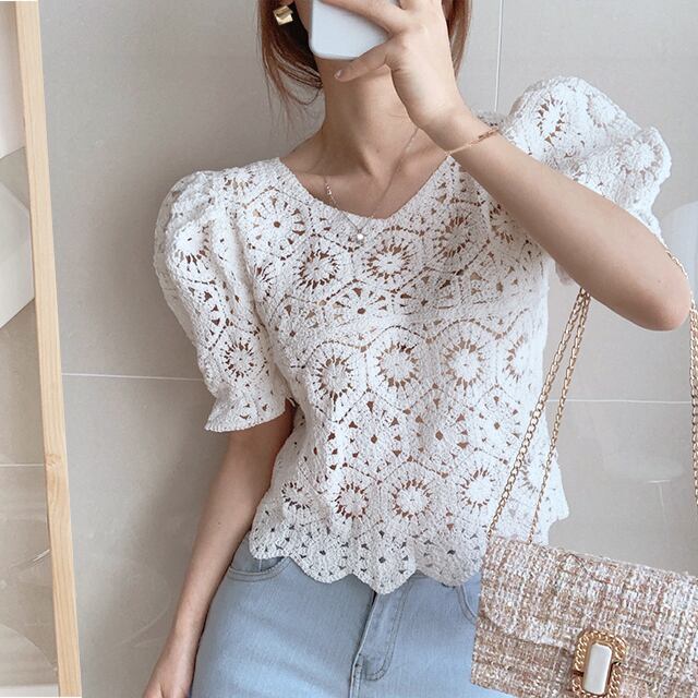 かぎ針編みシャツ トップス シャツ ショート ショート丈 袖あり 半袖 パフスリーブ Vネック 襟なし 透け感 かぎ針編み お得 かわいい 大人 おしゃれ お洒落 ラブリー キュート ガーリー 存在感 無地 春 夏 秋 ロングシーズン 10代 20代 レディース 女性用 学生 デート お出かけ 女子会 休日 イベント ランチ ショッピング 着回し 普段使い 重ね着 韓国 韓国系 オルチャン モテ インスタ映え フリーサイズ ホワイト アプリコット