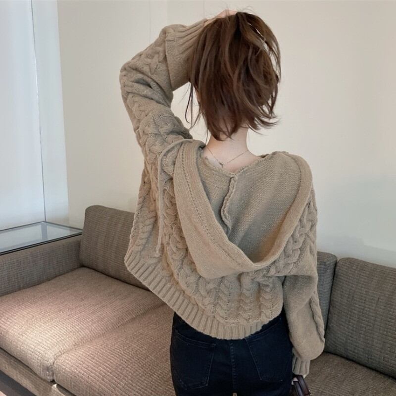 セーター パーカー ショート ショート丈 袖あり 10分袖 襟なし ノーカラー フード ワイド ニット ケーブルニット かわいい シンプル カジュアル おしゃれ レトロ こなれ感 ラフ キュート ルーズ ラグジュアリー 抜け感 ケーブル柄 春 秋 冬 10代 20代 30代 レディース 女性用 デート お出かけ 休日 ショッピング 着回し 普段使い 重ね着 レイヤード 楽ちん 体型カバー モテ トレンド 定番 ゆったり ゆる ブラウン