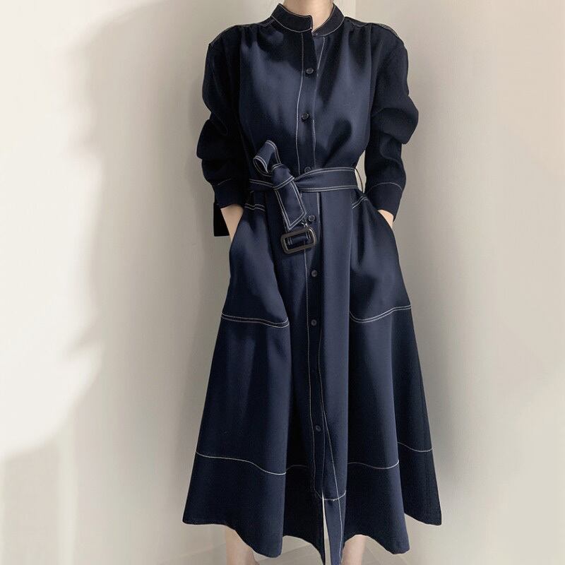 ワンピース シャツ シャツワンピース ミモレ ミモレ丈 ロング ロング丈 長袖 スタンドカラー ストレート ワイド ポケット 前開き コンサバ ベルト付き シンプル カジュアル おしゃれ かっこいい レトロ こなれ感 ラフ ルーズ 個性的 抜け感 無地 春 秋 10代 20代 30代 40代 50代 60代 レディース 女性用 お出かけ 旅行 ショッピング 着回し 普段使い レイヤード 楽ちん 体型カバー トレンド ゆったり ブルー 大人カラー