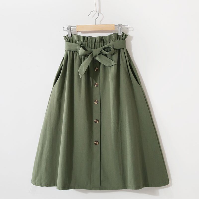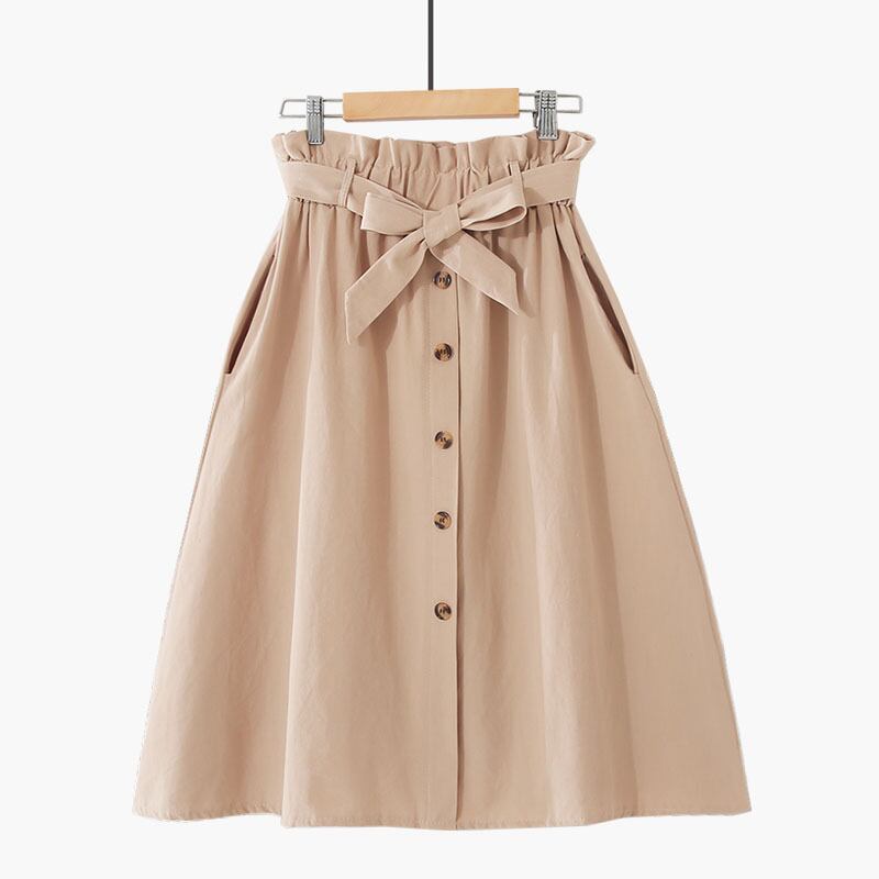 シャツのようなボタン付きのデザインがカジュアルな雰囲気漂うキレイめデザインのスカート。エレガントで女性らしい魅力を引き立てるミディアム丈。ウェストの大きめなリボンベルトが印象的。リボンがウエストを飾り、女性らしいシルエットを演出します。