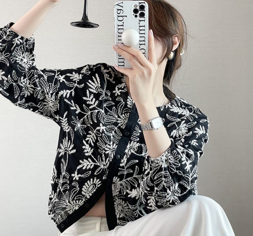 ノーカラージャケット アウター ジャケット 上着 袖あり 長袖 ボリューム袖 ラウンドネック 襟なし 刺繍 前開き 薄手 お得 かわいい 大人可愛い 大人 上品 おしゃれ お洒落 大人女子 ラブリー キュート 個性的 エレガント 存在感 柄 花柄 フラワー 春 秋 10代 20代 30代 40代 レディース 女性用 通勤 学生 デート お出かけ 女子会 休日 レストラン ショッピング ランチ お呼ばれ 着回し 普段使い 重ね着 モテ 体系カバー インスタ映え 二の腕カバー XS S M 黒 ブラック