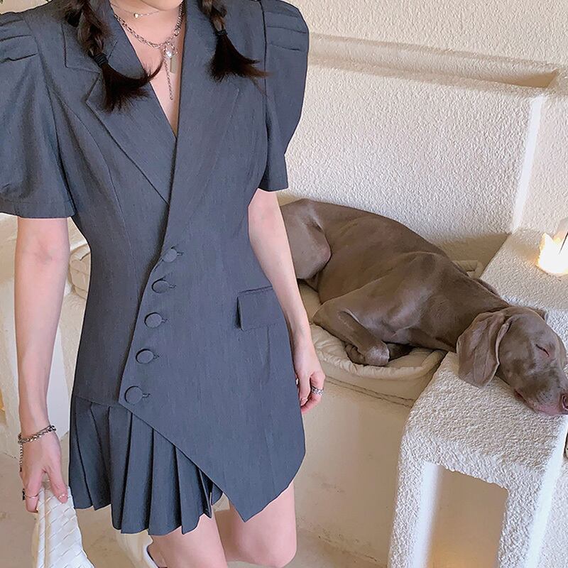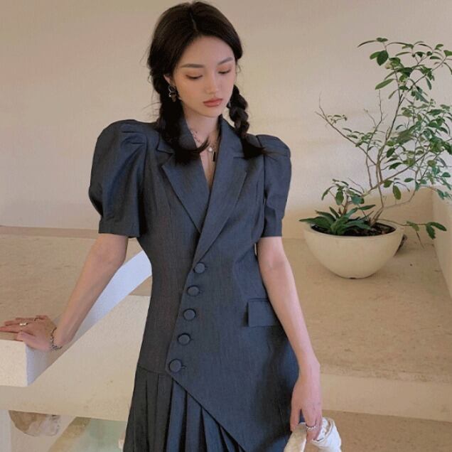 スーツ ジャケット ワンピース ショート ショート丈 半袖 ボリューム袖 パフスリーブ 襟付き Aライン プリーツ 切り替えデザイン コンサバ 大人可愛い きれいめ シンプル カジュアル 上品 おしゃれ レトロ こなれ感 ラフ 個性的 都会的 ラグジュアリー 存在感 フォーマル 無地 春 夏 会議 プレゼン 20代 30代 レディース 女性用 オフィス ビジネス OL 通勤 デート 休日 パーティー レストラン 特別 合コン 婚活