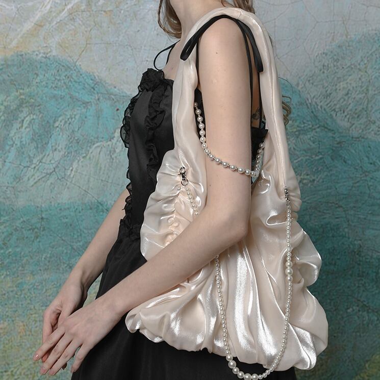 光沢とパールが華やかさを添える大人可愛いショルダーバッグ。パールとチェーンのアクセントがデザインされたバッグは、光沢と艶感のある素材が上品な印象を与え、大人可愛いスタイルを演出します。