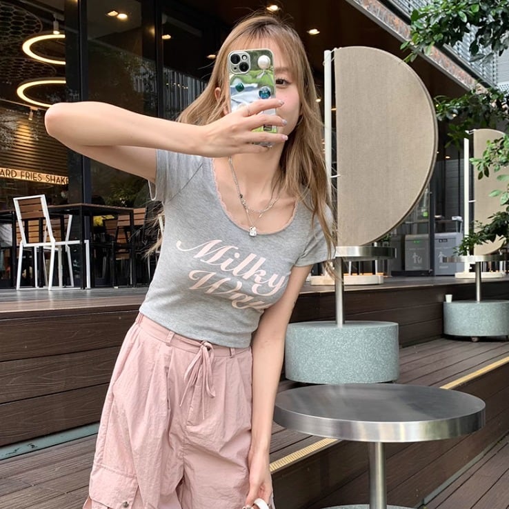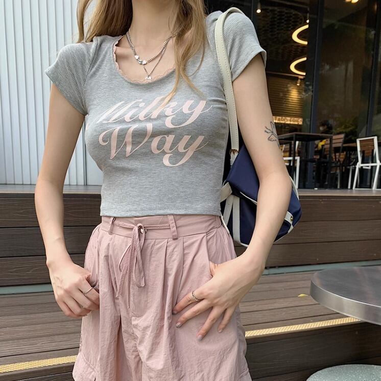 トップス Tシャツ ショート ショート丈 袖あり 半袖 Uネック 襟なし ノーカラー スリム 細身 レース リブ 伸縮性 ストレッチ 薄手 大人可愛い シンプル カジュアル おしゃれ レトロ 大人可愛い こなれ感 ラフ スポーティー ラブリー キュート 個性的 抜け感 ひかえめ アクティブ 無地 プリント 夏 レディース 女性用 学生 お出かけ 休日 運動 アウトドア イベント リゾート 旅行 ショッピング ダンス アスレチック 着回し 普段使い 韓国系 モテ 定番 トレンド フリーサイズ グレー